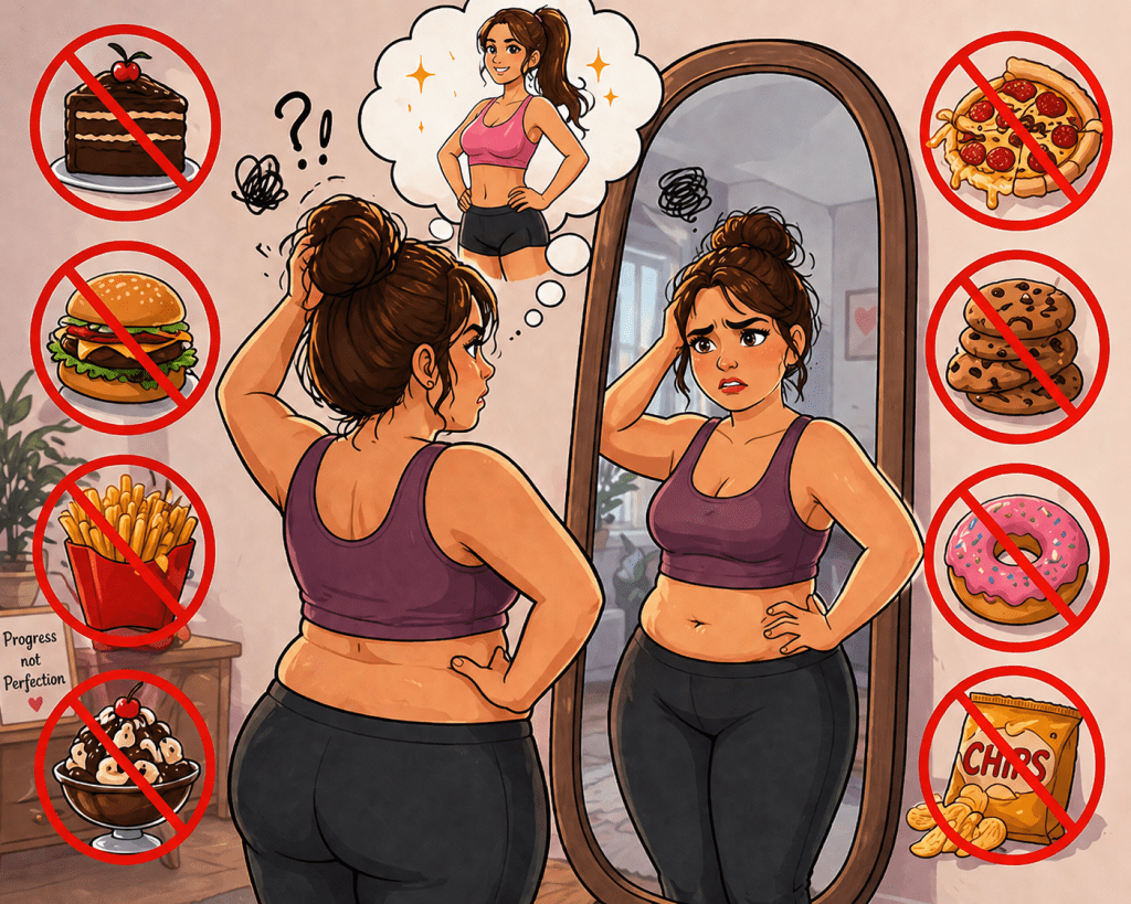 Third – Deprivation. The moment you tell yourself that you can’t have someting, it becomes all you can think about. Deprivation is one of the most powerful emptions we experience – historically, being deprived meant our very survival was at risk. And over time, these things create a cycle – restriction, craving, giving in, and starting over again.